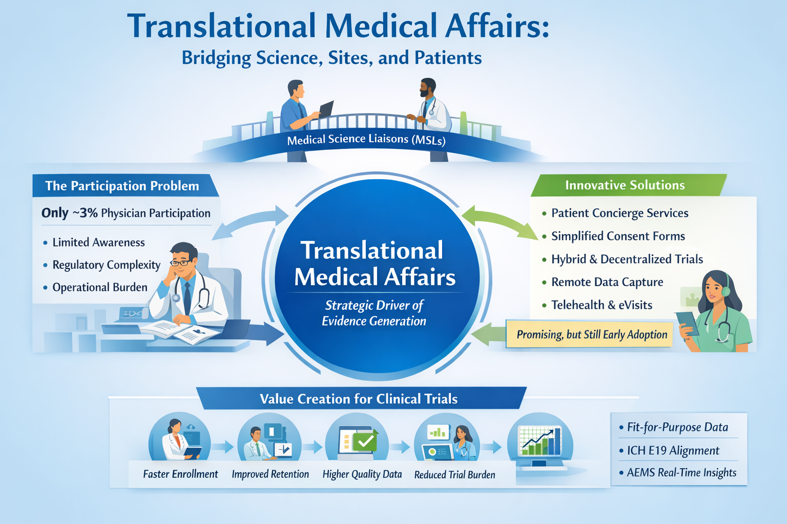 ● It is estimated that only about 3% of physicians in the United States actively participate in clinical trials.[1] Limited awareness of opportunities, uncertainty regarding regulatory requirements, and the perceived operational burden of trial participation all contribute to low engagement. As a result, enrollment capacity becomes a structural constraint in clinical development. Efforts are underway to address these barriers to physician participation through practical solutions such as patient concierge services, simplification of study materials (including informed consent forms), hybrid and decentralized study designs incorporating remote patient data capture, and expanded use of telehealth; however, while promising, these approaches remain early in adoption and there is still a long way to go before they meaningfully resolve these structural challenges. In this context, Medical Science Liaisons (MSLs) are uniquely positioned to address the gap by reframing clinical trial participation as a scientific and institutional opportunity, rather than an operational burden, thereby enhancing physician engagement and supporting more efficient study execution. MSLs can strategically position participation by emphasizing the following value drivers: